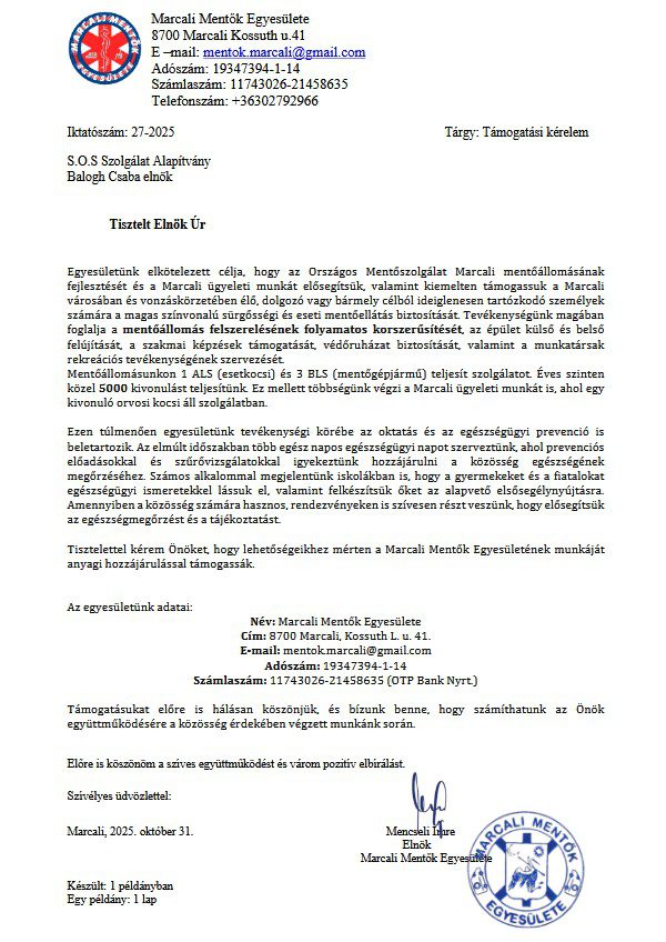 A Marcali Mentők Egyesületének áldozatos munkájának könnyítéséhez kérjük a támogatásukat.